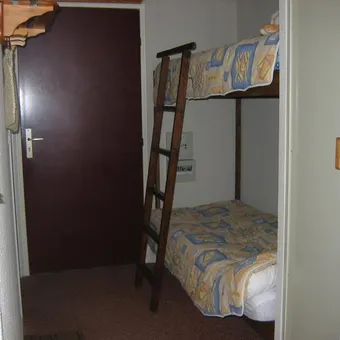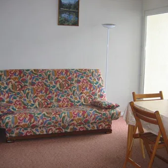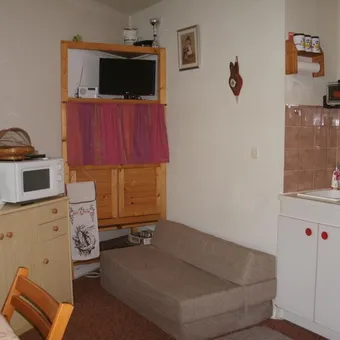 studio with veranda: view of the slopes living room, kitchenette, 1 sofa bed sleeping area 2 single bunk beds